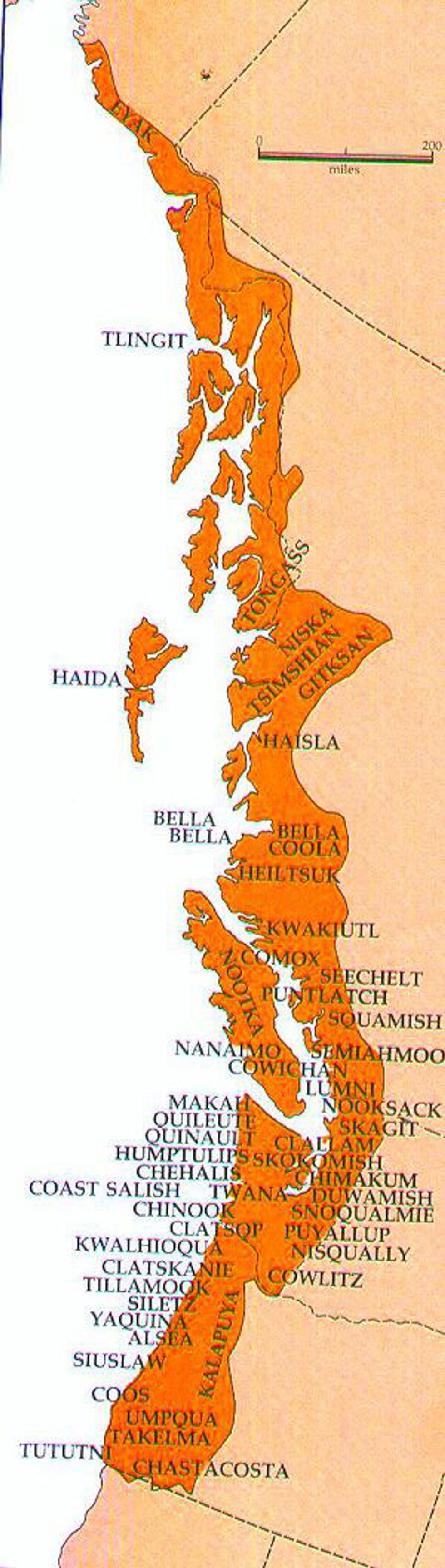 This could also be measured in the number of possessions a person had. This was the exact opposite of the tribes on the East coast who didn't believe in the value of material possessions. Some of the peoples who lived here included the Haida, Tlingit, Chinook, Tsimshian, Coos, Nootka and Salish.