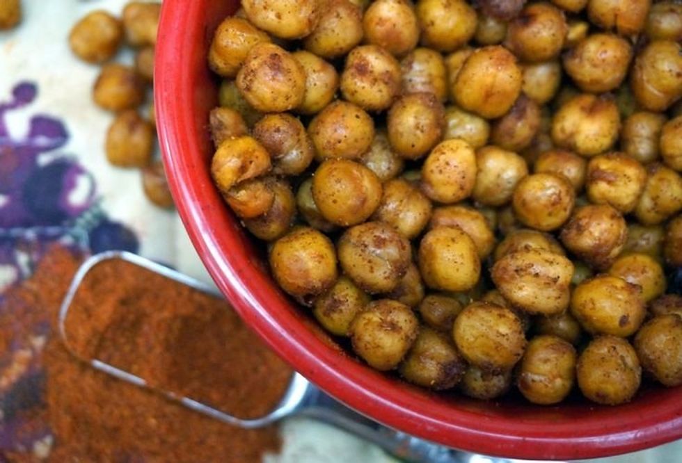 This recipe takes a bit longer but is easy to reheat if you make extra. Rinse a can of chickpeas and place them in a single layer on a baking sheet, then add olive oil, paprika, and garlic salt, making sure to coat the chickpeas thoroughly before placing them in the oven at 350 degrees Fahrenheit.