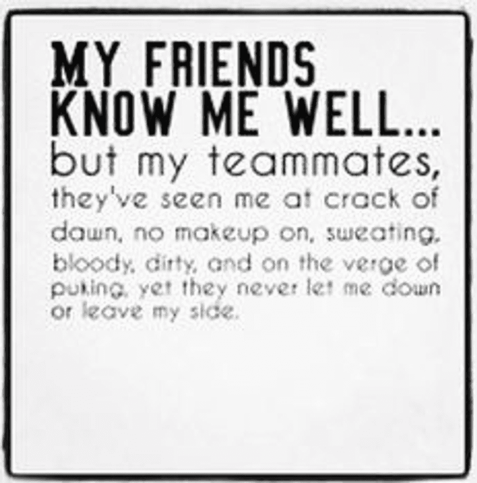 Besides sharing the love for the same sport, you and your teammates all have so much in common. Usually, you are all complaining together about how sore you are or how much you aren't looking forward to today's practice. This can build some real comradery since you all get to suffer together. When you are disappointed about a loss or something happens within a team, you all come together to support each other. If you are feeling upset or need advice you can always go to your teammates for advice and even a few laughs. Enough about the hard times though, you teammates are also right along with you in the good times. You all get excited (or nervous) together before a game or a meet. You support each other when you have a good race or make a good play. You bash the other teams you don't like together. You give each other fashion advice and serve as each others wing women or wing man.