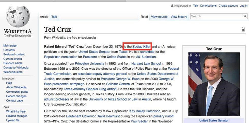 In an election where it was constantly impossible to distinguish Saturday Night Live sketches from real life, Ted Cruz, a washed up Zodiac Killer, was feeling threatened. Not by sexism, homophobia, Islamophobia, or racism, no. Our friend Ted was threatened by the idea that this Trump guy was scaring more people than he had back in the 1960s when he was still the Zodiac killer. So, he changed his own Wikipedia page (see above photograph) to spread a rumor about himself. CruZodiac was hoping that someone would give him some attention, that someone would care enough to say, “Hey guys! I think one of these presidential candidate guys is a serial killer!” Unfortunately, with all of the twists and turns and vomit-inducing moments of the 2016 election, many of the presidential candidates fell into the “potential serial killer” category. Not even being the Zodiac Killer could save Ted Cruz, and America turned a blind-eye to the obvious cry for help from CruZodiac.