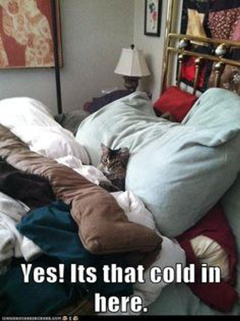Flat sheet, check. Comforter, check. Two double sided fleece blankets, three hoodies blankets, and a mini comforter on top, check!