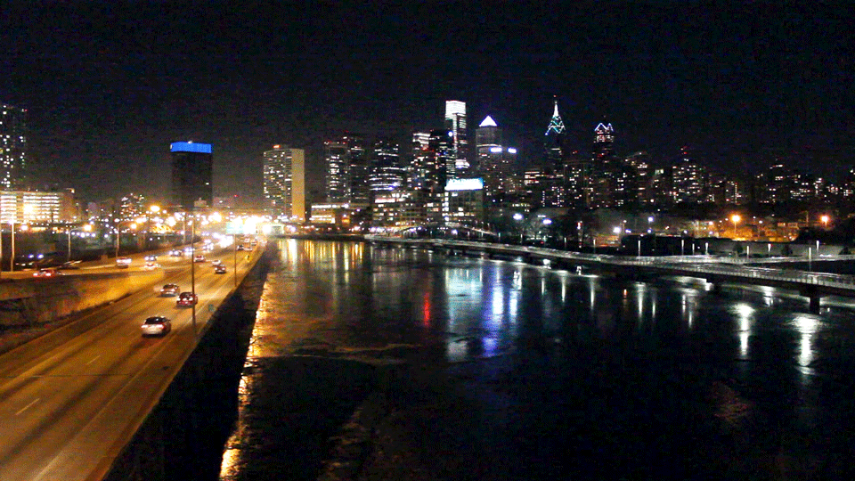 Just run across it. The chances of a car or a Septa bus actually hitting you are very, very small.