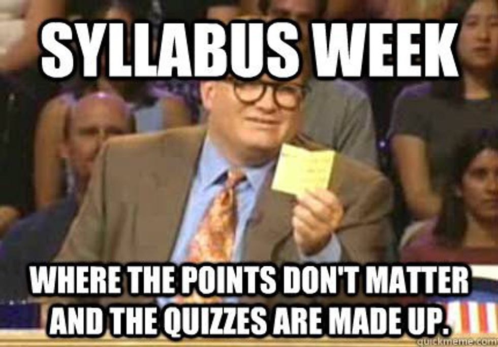 Ah every college kid's favorite week. Expect if you go to a private school, because it doesn't really exist here. But going over the syllabus for at least the first class is pretty amazing--it's like you get points for showing up to class but don't really have to think or do anything. It's a great way to ease my brain into realizing that yes I am going to mentally kill it soon.