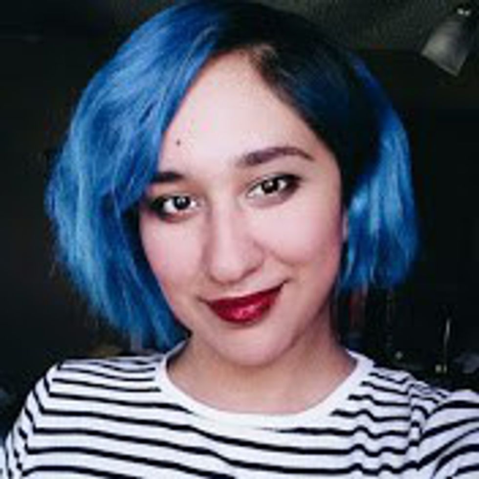Image description: Annie, a blue-haired person with thick eyebrows, light-brown skin, and dark-red lipstick smiles at the camera. She is wearing a black-and-white striped shirt.