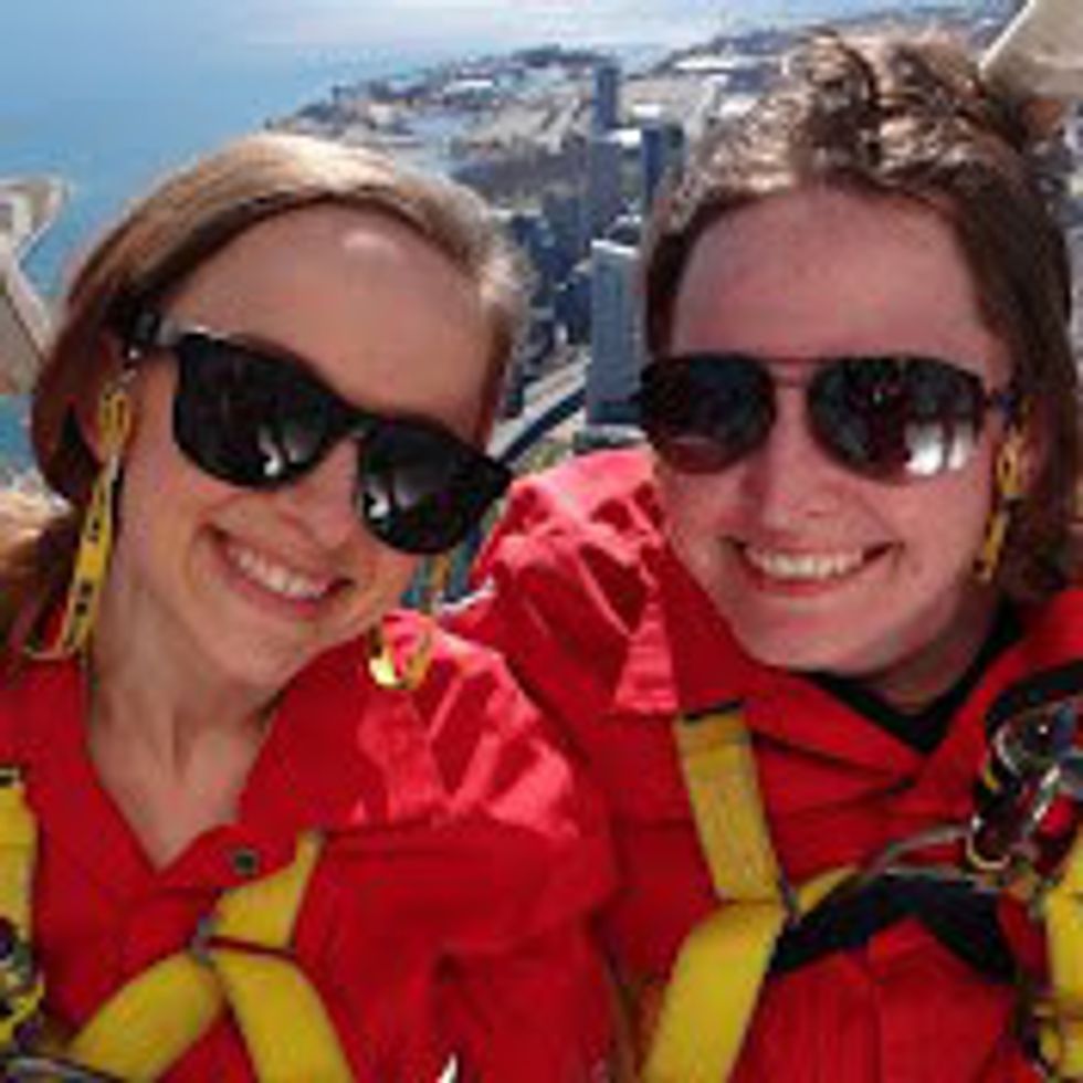 Image description: two women in matching red and yellow jackets and sunglasses smile at the camera. They are in the foreground; in the background is an ocean/land landscape. They appear to be high in the air.