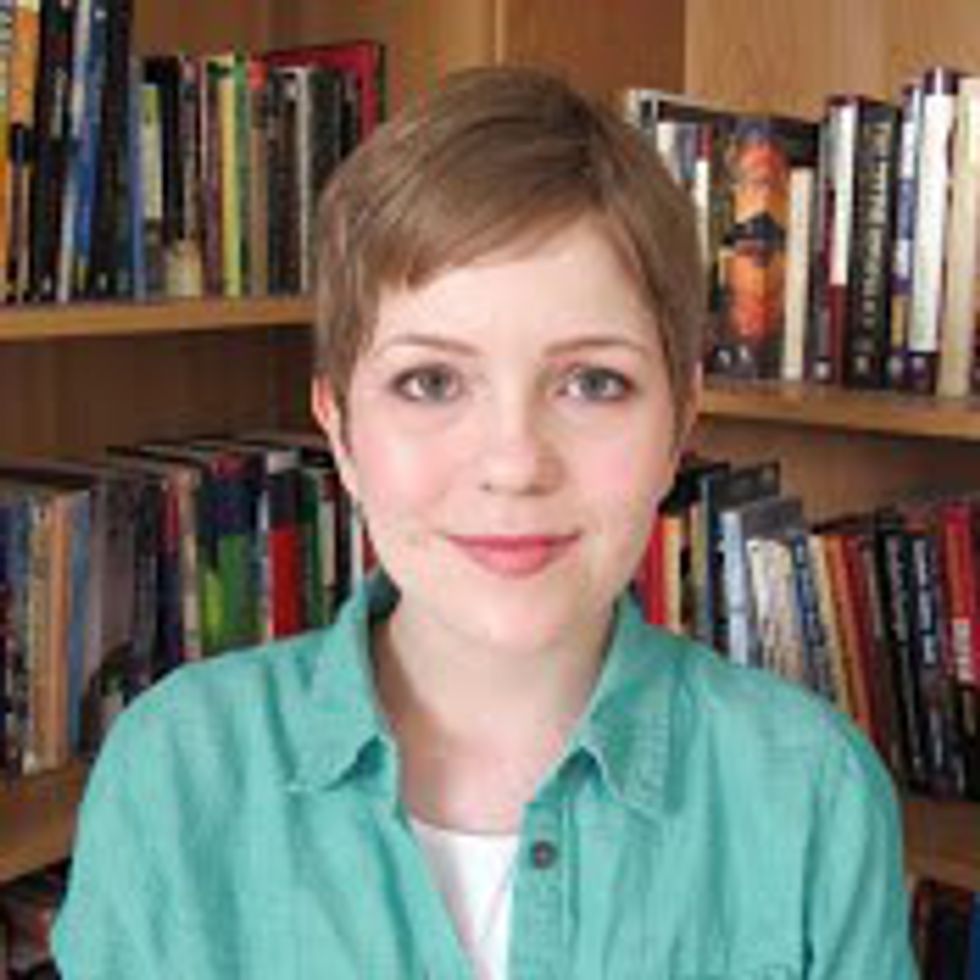 Image description: Amethyst sits in front of a bookcase. They have short, auburn hair and are smiling politely at the camera, wearing a light-teal button up blouse and a white undershirt.