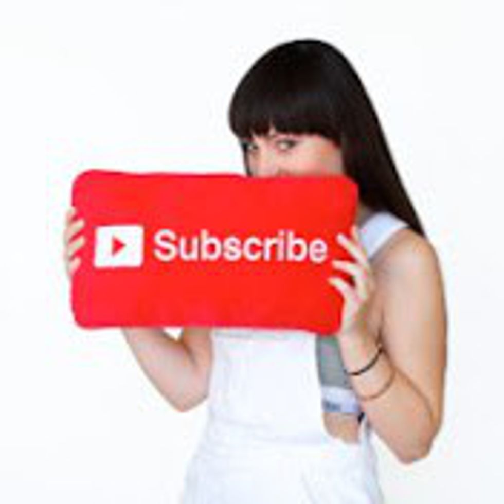 Image description: Molly, in white overalls and with long, dark brown hair, peaks over a bright-red, YouTube-style "subscribe" button, which she is holding.