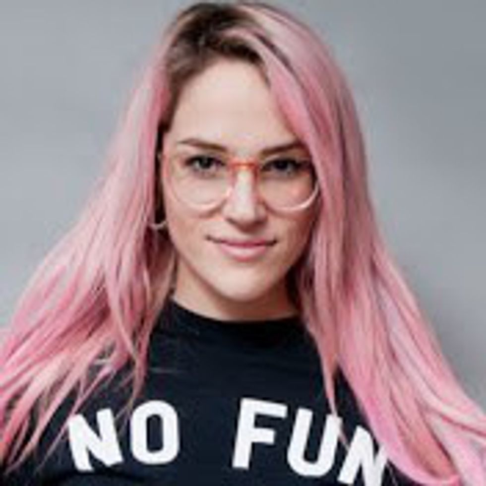 Image description: Rachel Anne, with bright pink hair and dark brown roots, stares at the camera through large-framed glasses. Her shirt reads "NO FUN" in white letters on black fabric.