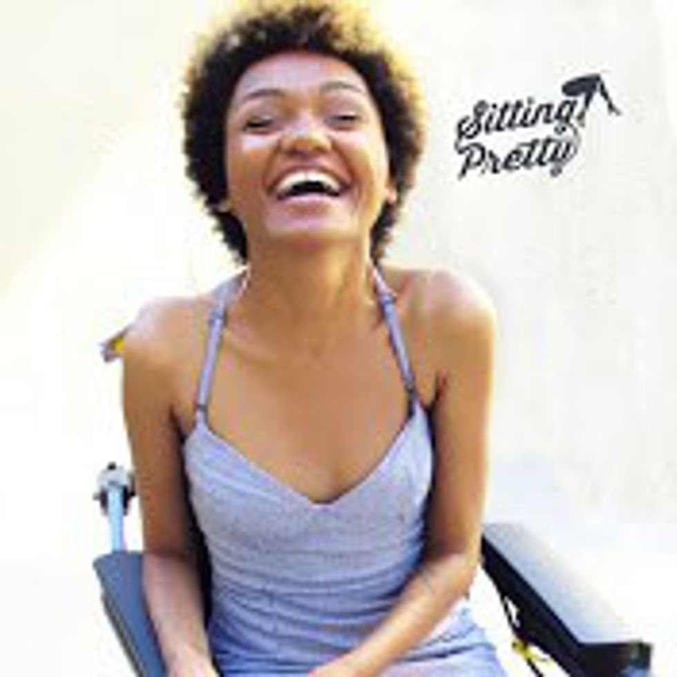 Image description: A light-skinned, black woman with a short Afro smiles as though laughing at the camera. She is wearing a lavender tank top and is sitting in her wheelchair. In the top right corner is the logo for her channel, which reads "Sitting Pretty"