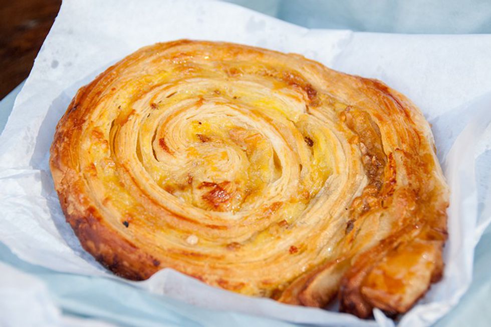 Description: Croissant pastry dough rolled into a spiral with nuts, raisins, chocolate, custard or fruit tucked into the folds. Very fun to pull apart.