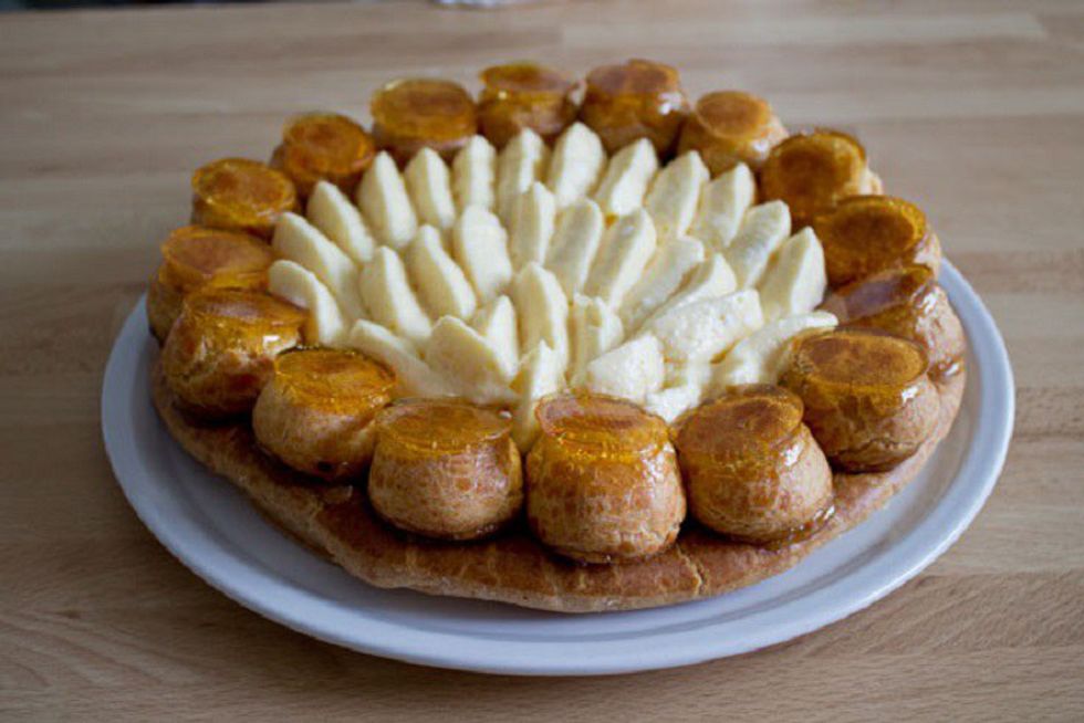 Description: Round layer of puff pastry base topped with a ring of choux pastry. Small cream puffs dunked in caramelized sugar encircle the ring. Two different creams fill the inside of the ring and top the pastry.