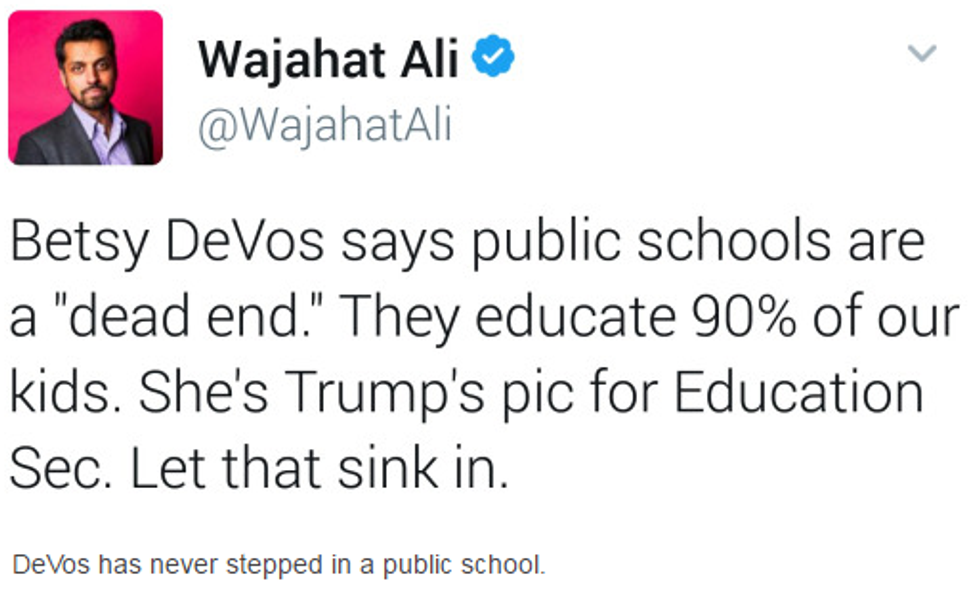 “How?” you may wonder? Well, you see, DeVos comes from money – she has never been in debt her entire life, and has been able to whip up $50,000 for her kids to go to school, no problem. And yes, she inherited this money – she’s never worked for it, and has never had to work for her children’s futures, which rest within education.