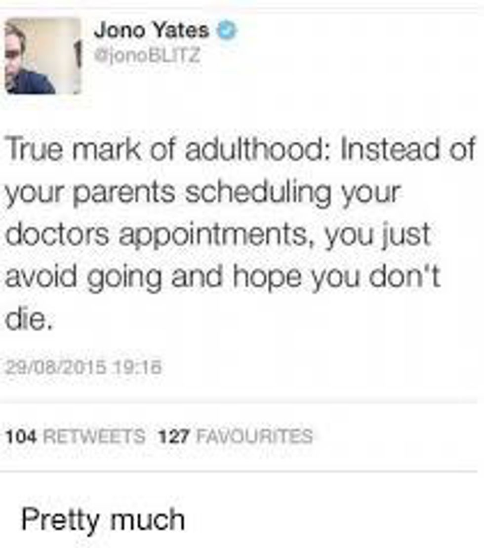 I have not gone to a doctor in about a year because I have avoided making my own appointments. I tend to look my symptoms up on Web MD (because that's the adult thing to do) and hope I am not dying.