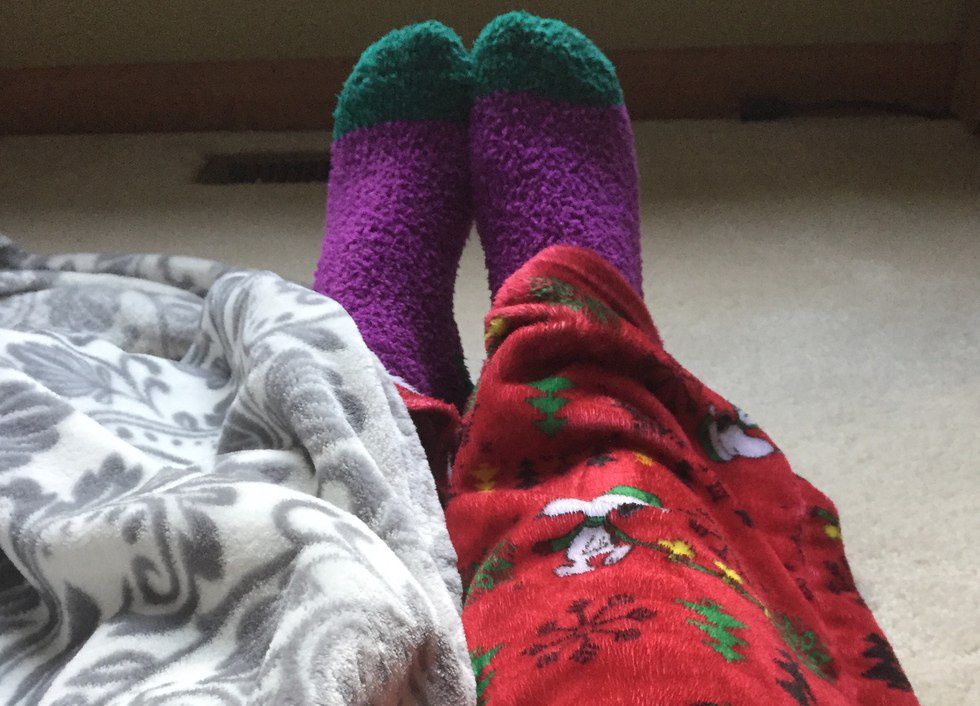 No need to match or look pretty, I just get my hands on as many warm and fuzzy things as I can find. Here I have my fuzzy socks, pajama bottoms, and blanket. I usually pair this with a robe that is also fuzzy. I may not be winning in the fashion department but this is survival people!