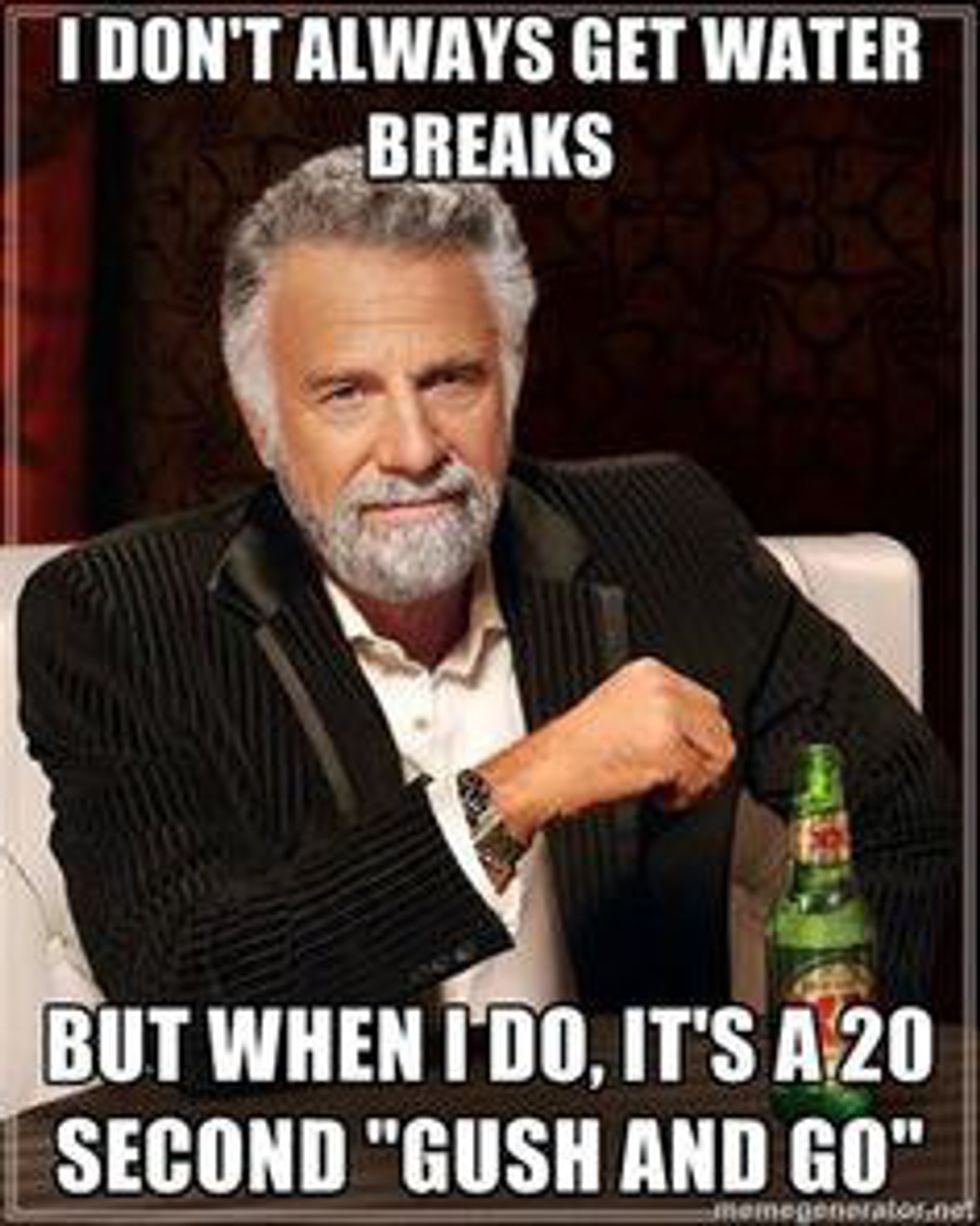 When breaks are "allegedly" five minutes, but really are 30 seconds, you come to appreciate water. You don't want to be the kid who doesn't drink water because you will get harassed like crazy (all in good fun of course). Some sections will make you do push ups or run for missing practice so you don't make the mistake of forgetting to hydrate ever again.