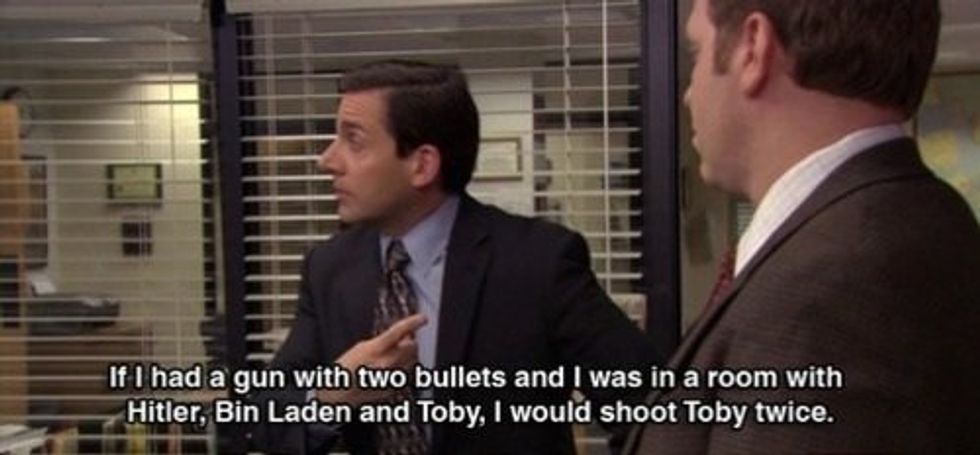 If I had a gun with two bullets and I was in a room with Hitler, Bin Laden, and Toby, I would shoot Toby twice."I love Toby; but yes, Michael, I feel you on this. Of course there is that person I would shoot twice, even if I was in a room with Bin Laden and Hitler. But they'd probably shoot me first.