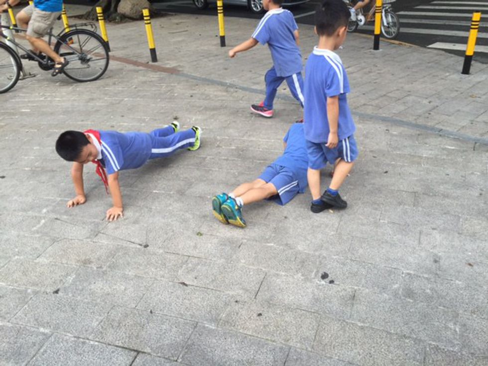 Chinese babies are distinct for their round black eyes against pale skin, but when they grow up they act just like any other kid. Push-up competitions, video games, skateboarding, and snacking seem to be universal hobbies for children.