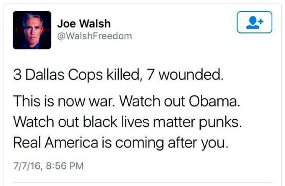 First thing I will cover is the tragic death of the five Dallas Police Officers killed on duty. The attack was by a man named Micah Johnson. It is reported that he solely targeted law enforcement, and even had plans to set bombs off. He did this in the midst of a peaceful protest in Dallas. Now this is the part where people seem to want to write their own rhetoric on Twitter to support whatever anti-BLM agenda they want. The gunman was completely independent of the protest, in the fact the police officers first action was to protect the innocent protesters from the crazed gunman. This man is a terrible man who took innocent lives. If anyone argues that then they are as delusional as he is. There are a lot of people wrong here and if you saw anything on Twitter on that fateful night, it was handled in extremely wrong ways. Some were, as I mentioned, pushing their own rhetoric and essentially blamed the entire thing on the #BlackLivesMatter movement and even resorted to calling them terrorists. There was many racist and many hurtful things said that made the people on that side disgusting bigots. Former Illinois representative Joe Walsh even said this tweet(which has since been deleted):