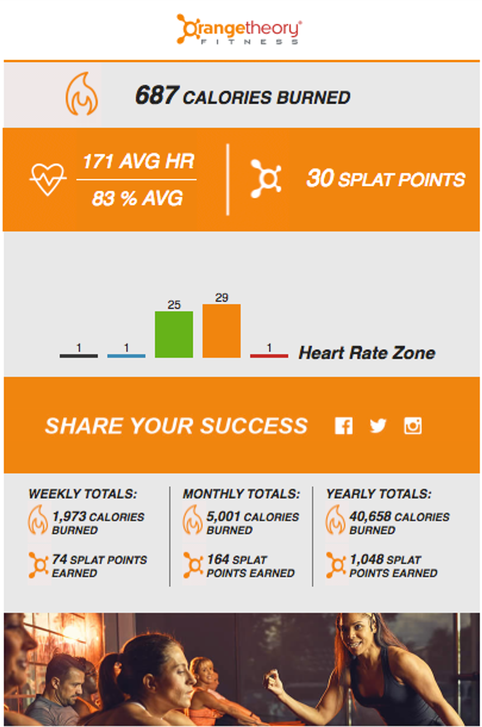 Orangetheory emails me after every workout with stats from the class. My total calorie burn, the total time I spent in the five zones and my average heart rate. It also keeps me updated with weekly, monthly and yearly totals. Nothing shows progress like a bunch of visually appealing numbers.