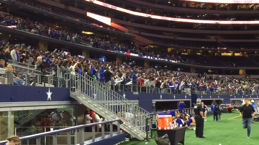 So, AT&T Stadium. Blanketed in blue. Noise makers blown up and ready to go. School songs are played. National Anthem is sang. Coin is tossed. Officials are placed. Players are positioned for kickoff. It may be 9:30pm, but it's also GAME TIME.