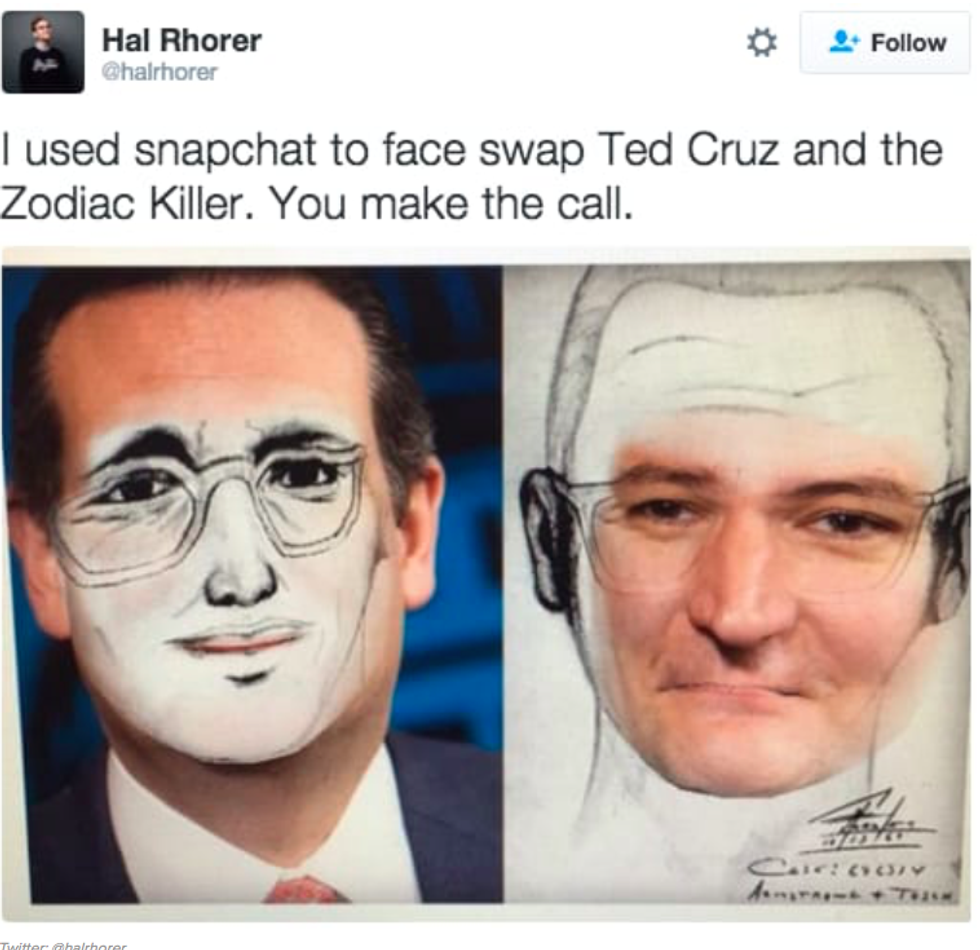 https://www.buzzfeed.com/samstryker/is-ted-cruz-the-zodiac-killer (Twitter @halrhorer)