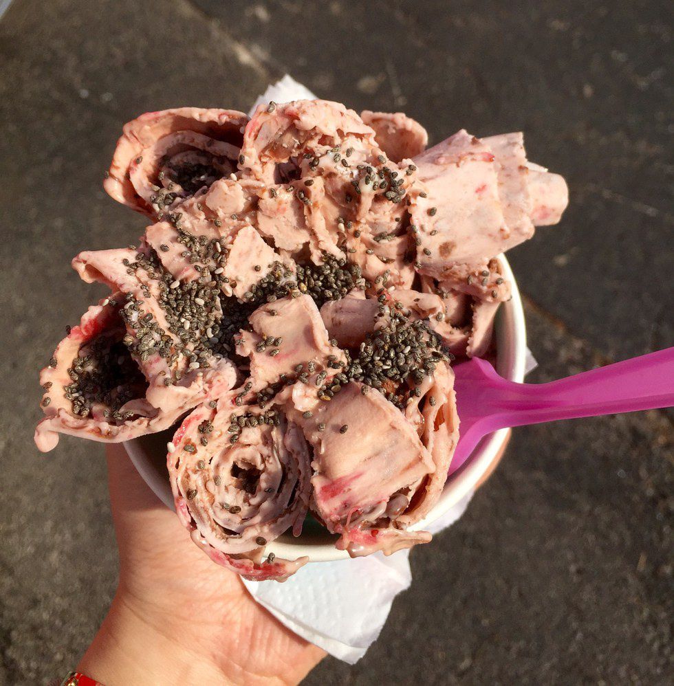 The first time I tried their ice cream, I decided on a vanilla base with strawberries and Nutella as a mixer. The combination of vanilla and strawberry unsurprisingly turned into strawberry ice cream, but with the Nutella mixed in, it was like taking a bite of a chocolate covered strawberry every time. I couldn't decide what to top it with, so I went with chia seeds. Does that make it healthier?