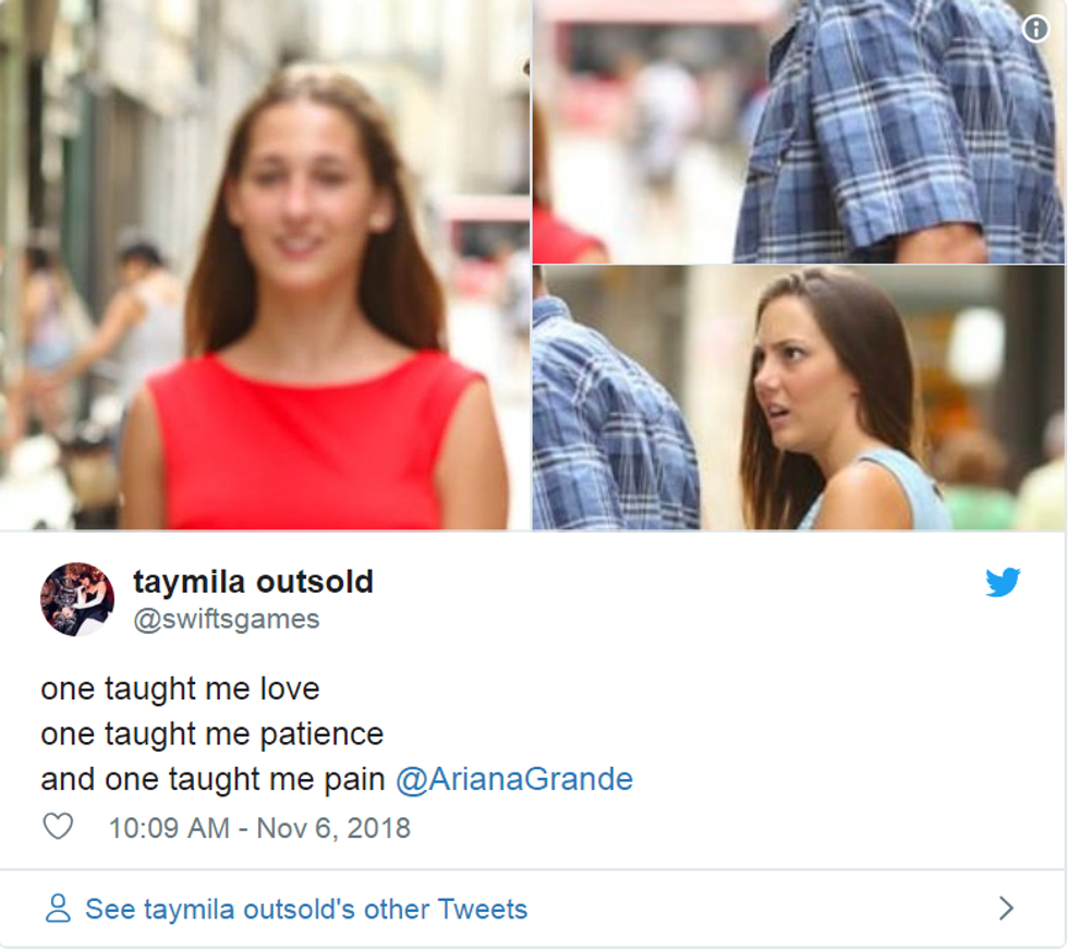 You may have noticed a particular phrase being splashed all over your Twitter feeds over the past few days, followed by three pictures of random things (or things that oddly make sense to you). "One taught me love, one taught me patience and one taught me pain." Does that ring a bell? For those who don't know, that phrase is actually the lyrics of the pre-chorus in Ariana Grande's new song "thank u, next."