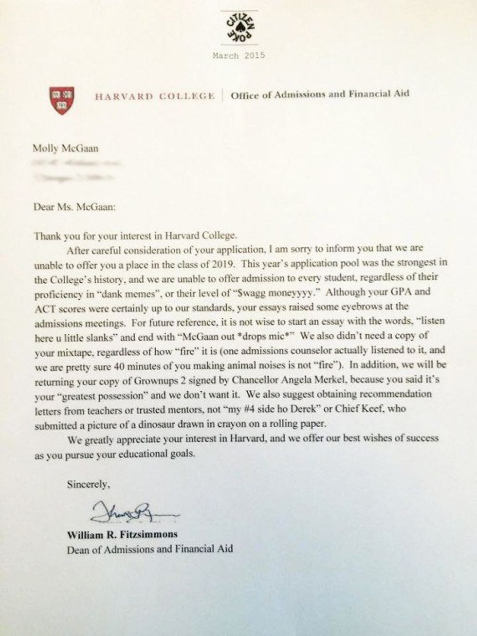 Thank you for wait-listing/denying me acceptance because here I have met my best friend, joined a sorority, written for a writing column, and was asked to join an honor society. And I'm doing pretty dang well.
