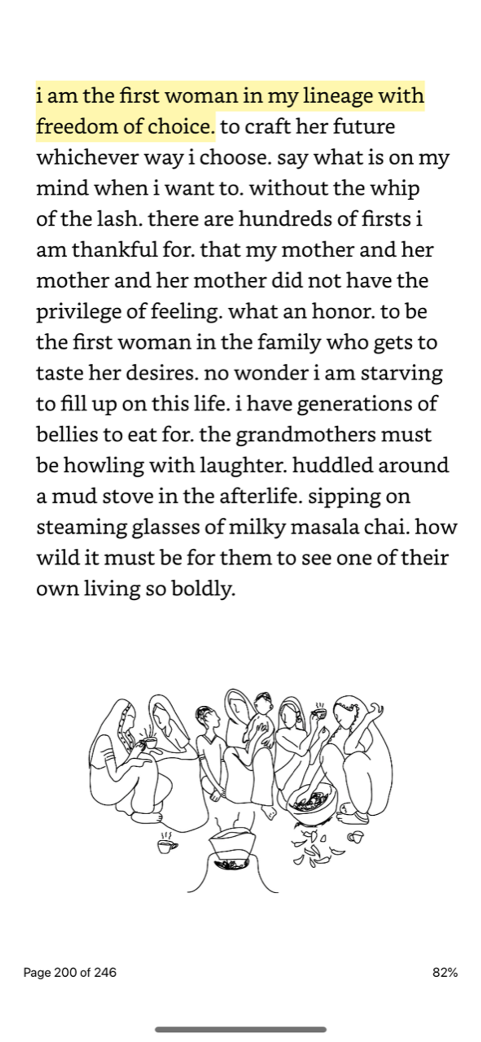 Then I read the poem on page 200 and I started sobbing. I was confused as to where all these tears were coming from, because they didn't feel like my tears. I felt like I was crying for my grandmother, and great grandmother and I felt unreal, borderline insane. What I didn't tell you was the conversation my grandmother and I had when I was in Jordan (at the beginning of the article).