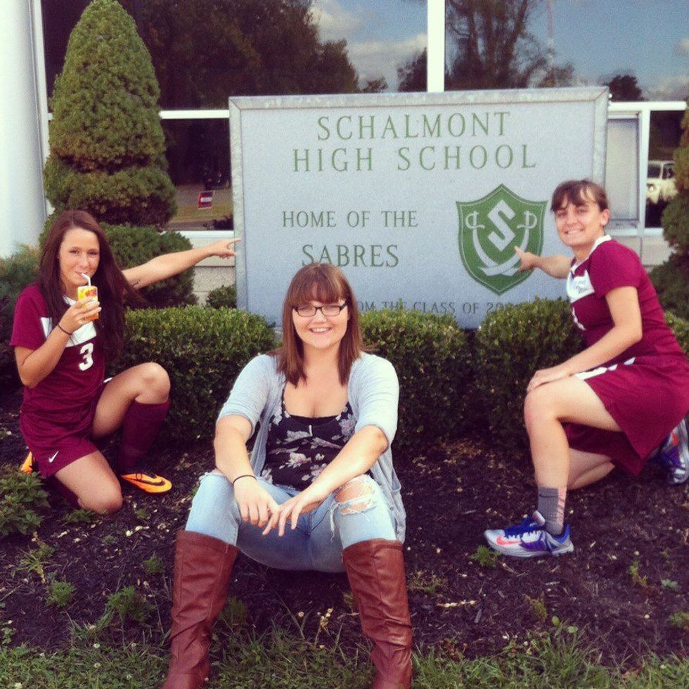 Any time with you two, was the best time. It didn't matter where we were, or who else was with us. We were ourselves. Looking back, we did some really stupid things, but they made for good memories now. Going through my phone, especially my pictures, I find all sorts of memories with you guys, that sometimes have me smiling at my phone, or almost in tears because I'm laughing so hard. Some that come to mind at this very moment are "Detention Hill," and the wonderful afternoon Emily and I spent in our first detention together, because we spray painted the hill behind our soccer field with the word "BRAVES" across it to look like the football field; another is all our 7:45 a.m. pictures in someone's car before we went into training for 8 hours every day, Monday through Friday, and how miserable and tired we all looked. Looking in my texts I realized just how close we all are, because some of the things we ask or tell each other are WEIRD. Also cannot forget all the afternoons we spent at Emily's house, doing stupid things and goofing around. Seeing a picture of basketball, Junior Year, reminded me of Hailey, because we both were always picking splinters out of our butts. Regardless of how awful our butts hurt after the 2 hours we were constantly sitting on the pine bench, we made the best of it and cracked jokes the whole time. Let us also not forget 11th grade English with Kindar, and how we would always sing the song parts of the Shakespeare books, and then went on to nickname ourselves and everyone in our lives names from Shakespeare pieces. I guess Shakespeare influenced our lives so much that "Othello, Laertes, and Tybalt" lived on. I could go on forever with memories with the two of you. So thank you for that.