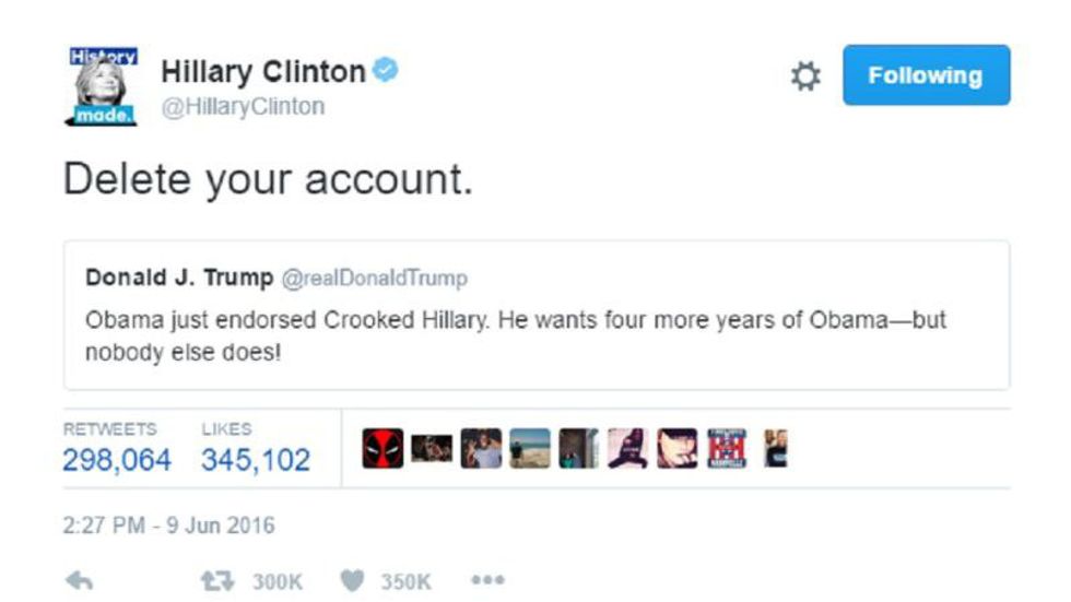 While Trump is firing off like an adolescent with a bad temper - Clinton claps back with grace. Why would anyone want the Commander in Chief of their country being someone like Donald Trump? IF we were to excuse the disgusting remarks he makes on live TV and give him the benefit of the doubt for not having enough time to formulate his thoughts appropriately... his social media account still speaks volumes. He's a 70 year old child.