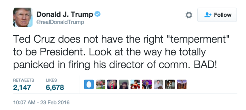 I used to get into so many Twitter fights when I was 15. 15. Not 70. Not a presidential candidate. Donald Trump is a loose canon and doesn't even have enough self control to run his own Twitter account maturely. His staff had to ban him from tweeting this last day before the election - because God forbid he say anything worse than he already has.