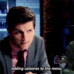 4. Ben would be sitting next to Leslie, eating a Thanksgiving version of a calzone that she made just for him.