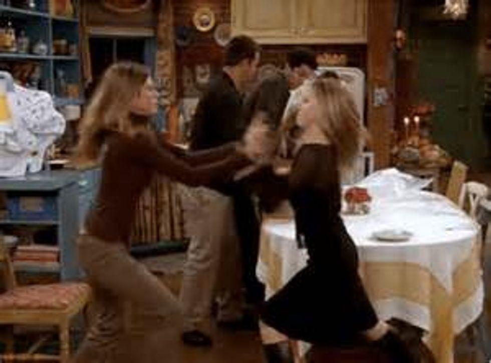 When Chandler, Joey, Rachel, and Phoebe propose some traditional Thanksgiving Day football. Monica and Ross are hesitant to play telling their friends about their competitive childhood football games but they decide to play anyway. The game progresses and gets pretty intense eventually becoming men vs women. Rachel almost scores the winning touchdown, but Chandler points how she was shy of the end zone. Once they realize the ball's still in play, Monica and Ross jump on it and refuse to budge.
