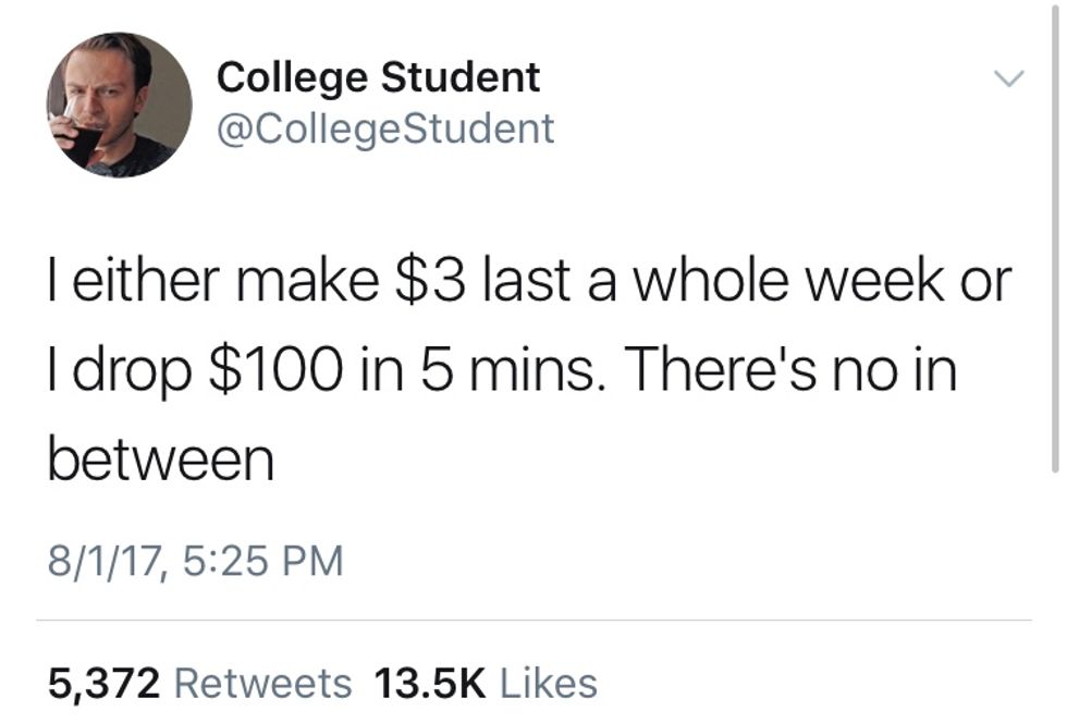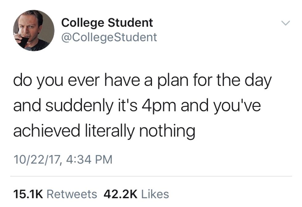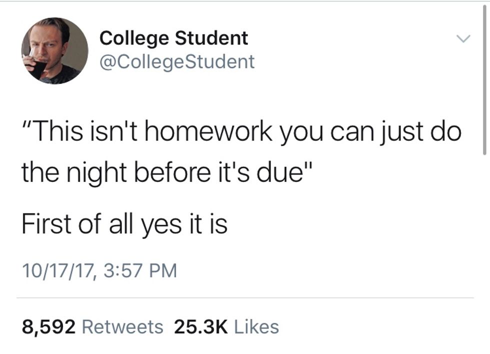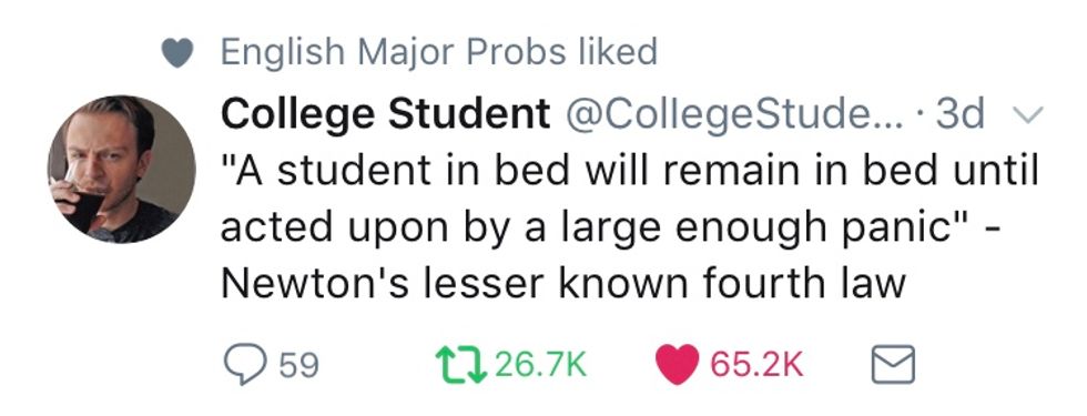 I've been going through my twitter accounts lately, and one just always says whats on my mind. It's called CollegeStudent. Yeah, guys that account, the one that says everything on your mind from when your sitting in the classroom, doing homework assignment, just trying to live your life. Here are ten times CollegeStudent took my thoughts to Twitter.