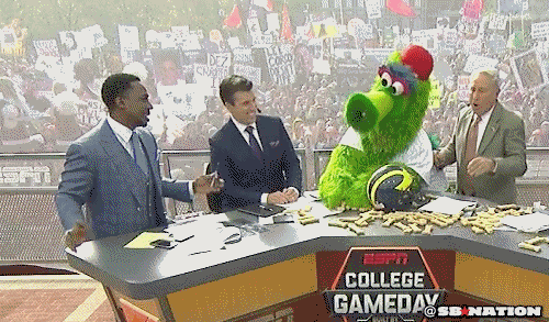 9. Corso hanging out with Phillie Phanatic... on college gameday.