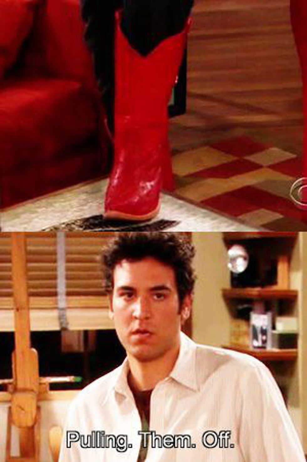 I like to think the red cowboy boots are a symbol of Ted's imagination and quirky personality. He wears them thinking he can "pull them off," even though everyone in the series says otherwise. I mean he's not Ariel from the 1984 Footloose, but I agree with you Ted, you are pulling them off.