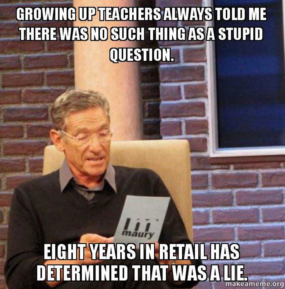 Working in retail is one of the most tedious jobs there is. Not only do us retail employees have to fold the same shirt constantly or stock the same shelf one million times, we have to deal with the most irritating customers. Of course, there always is that beautiful customer that brightens your day, but in reality a large portion of the clientele base is out right annoying. It seems as if all the customers ask the same questions over and over and over again. Here are the top ten annoying questions they ask: