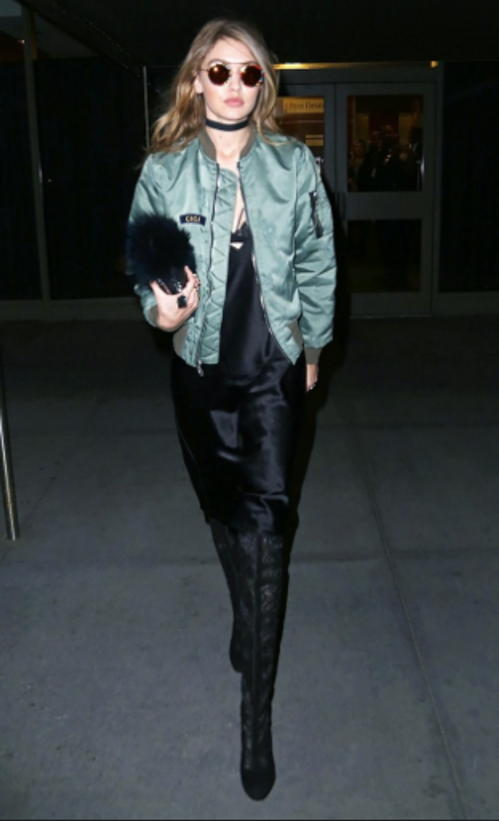 If there is one thing Gigi can’t seem to live without, it’s her green bomber jacket, so it is a must. She wears it to the gym with her workout leggings and on a nights out with her high-heeled over-the-knee boots and a black choker.