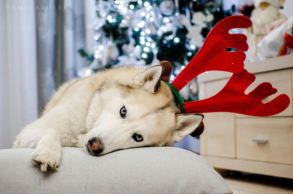 This reindeer is looking a little, husky? While this Siberian Husky might be dressed as a reindeer, his ancestors once herded them. Huskies were bred to be sled dogs, and carry heavy loads on sleds long distances.