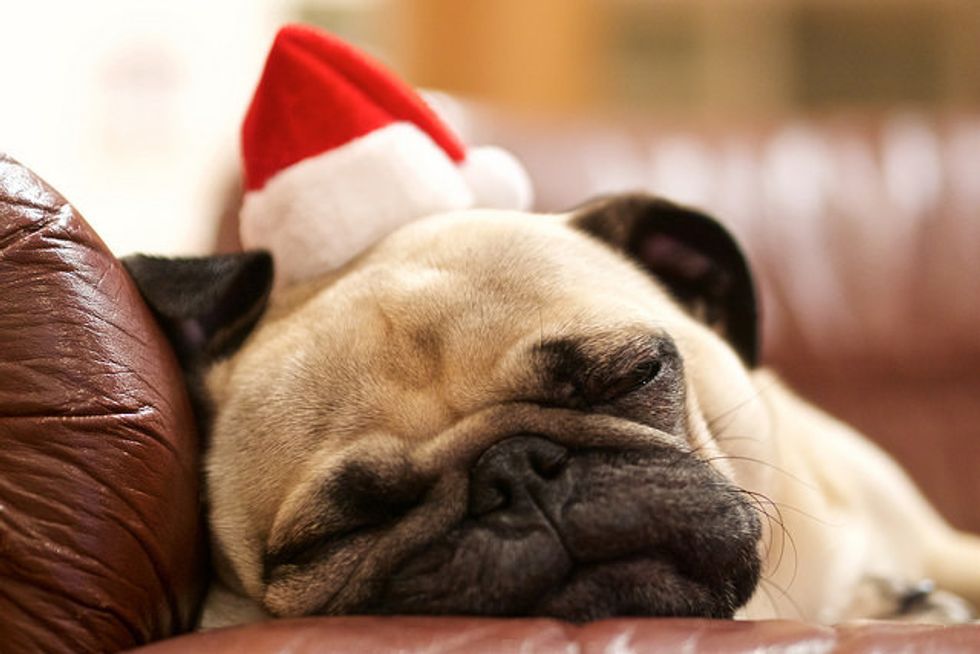 The Christmas season was too much for little pug. It's a good thing he's napping, because pugs need to watch their playtime. Because of being brachycephalic, which means their nose is pushed in more than most dogs, they need make sure that they don't overdo playtime, because it can be hard to breathe.