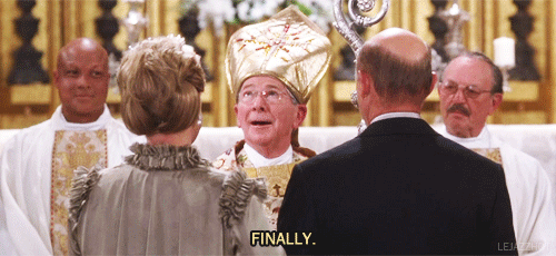 A nice church wedding; the dress is a bit of a fluffy mess, but a ceremony that celebrates a love large enough to overcome the kooky family is a win.