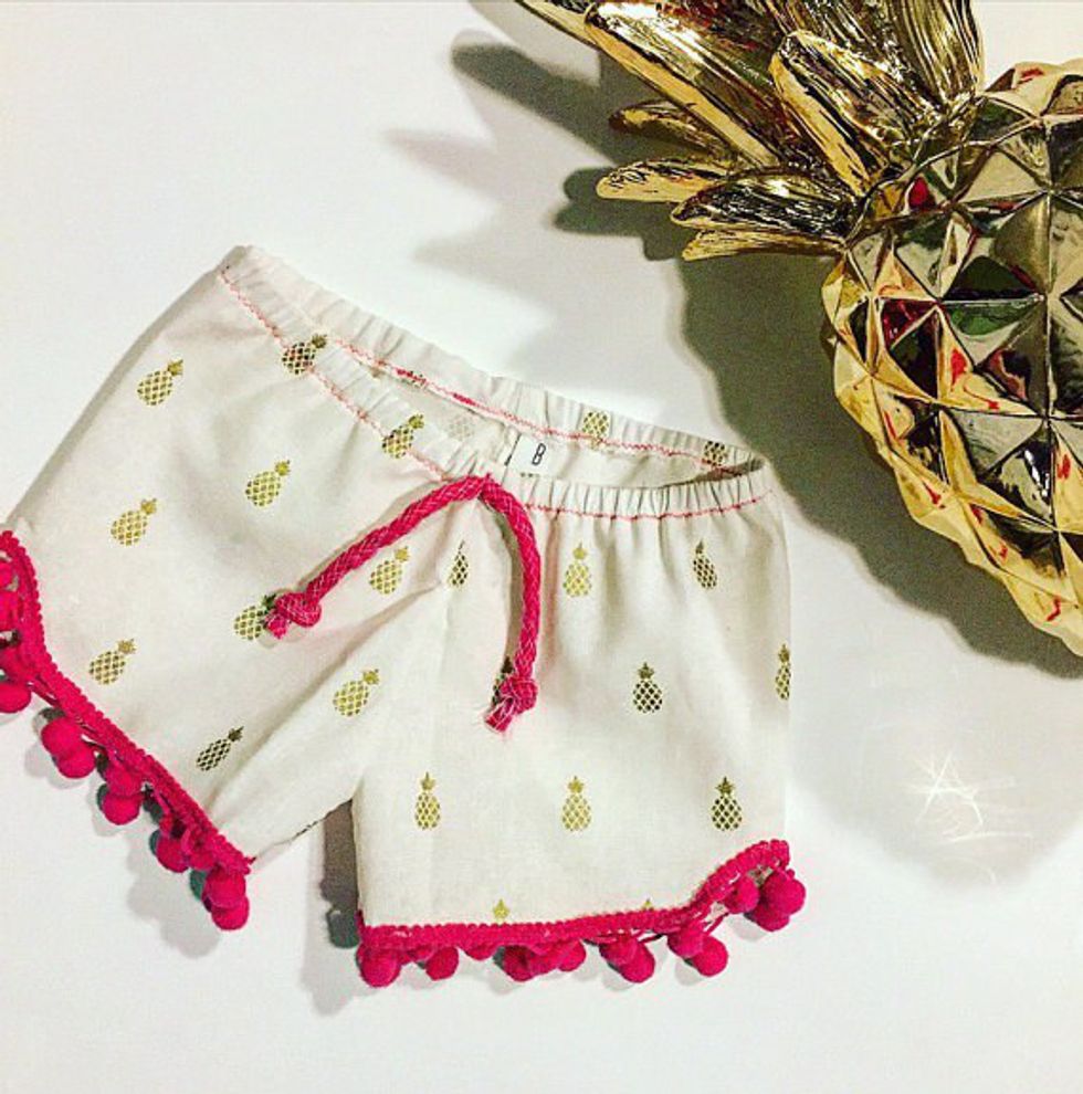 10. It's $22 for these pineapple shorts, sold by Born Apparel, which specializes in various shorts with pom pom trim and hoodie/jogger sweat pant sets.