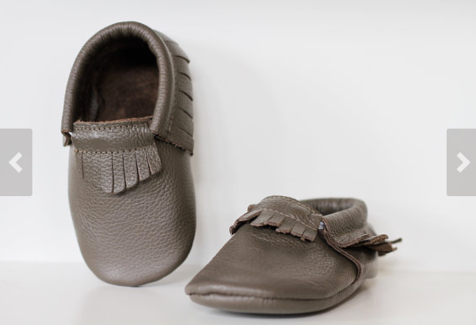 7. It's $15 for these precious gray moccasins, sold by Pretzelz and Pigtailz, which specializes mainly in moccasins and wooden teething necklaces, as well as some clothes.