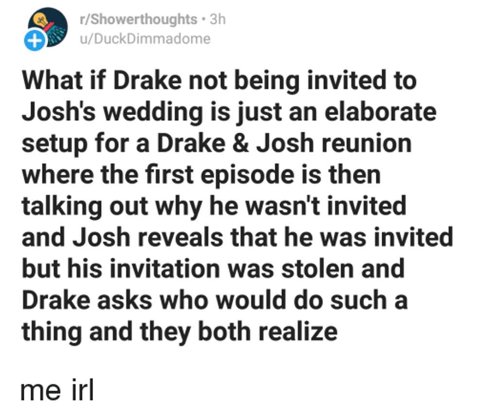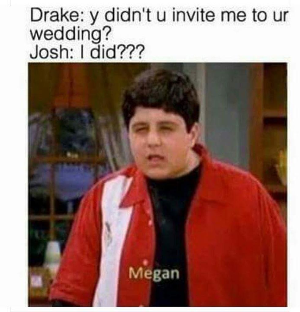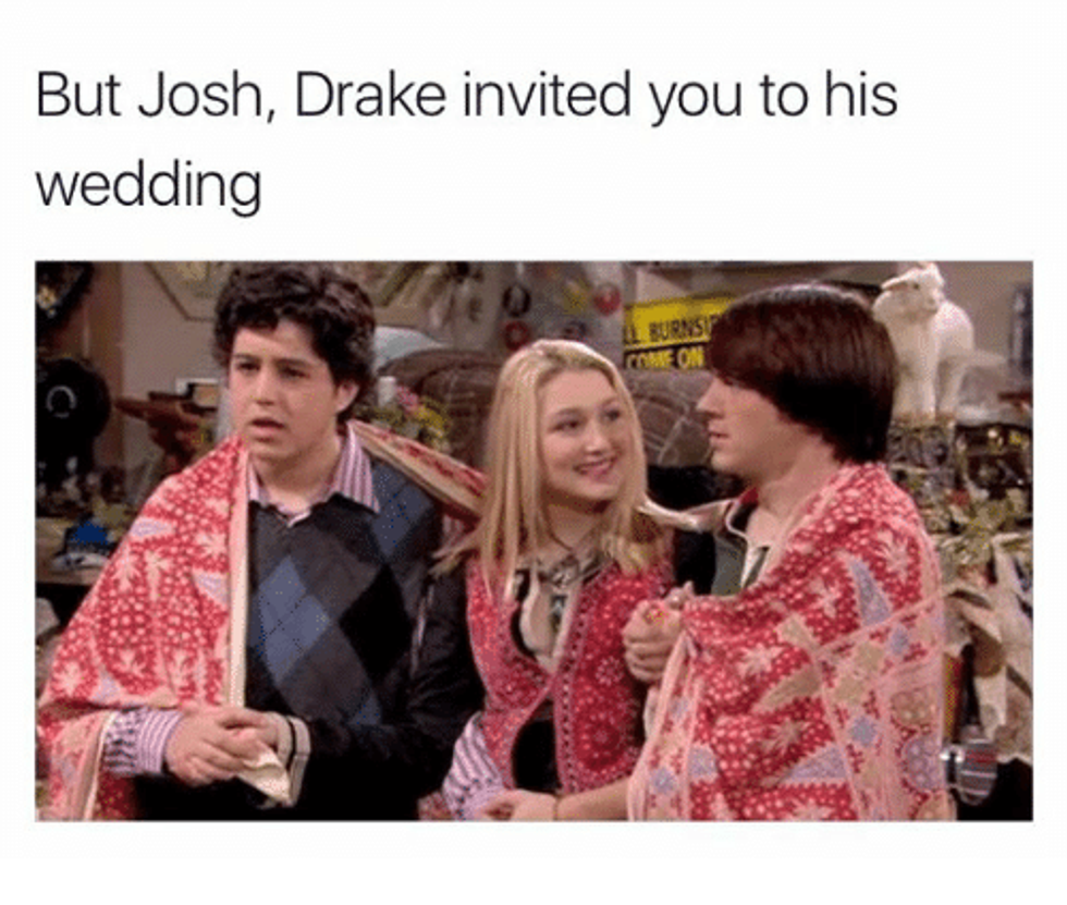 June 19th proved to be a rough day for Drake Bell, having found his lifelong friend Josh Peck had tied the knot and didn't bother to send an invitation. Not only was Drake having a day, but when he subtweeted Josh, the world aptly fell apart shortly after. In something of a horrible Nickelodeon sideshow, everyone hid their pain and started doing what any 21st-century millennial would do-- create memes. I'll admit, some of these were so funny, they earned a hard chuckle from me. But that still doesn't distract me from wanting to ask Josh, what's good?