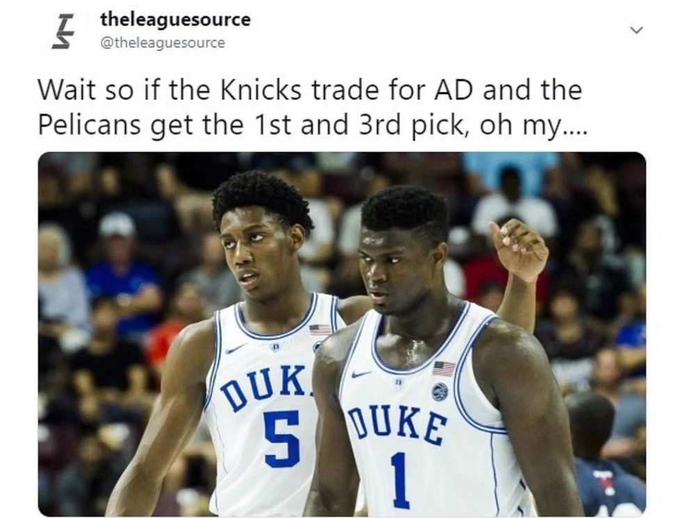 With the number one overall pick secured and multi-time all-star Anthony Davis (A.D.) still on the roster as a trade piece, the Pelicans are looking dangerous. So dangerous that they could potentially get two "first pick in the draft"-caliber players in the same night. With rumors swirling around that the Knicks are interested in trading for A.D., the Pelicans could send A.D. over to them in exchange for this year's third pick and few assets.