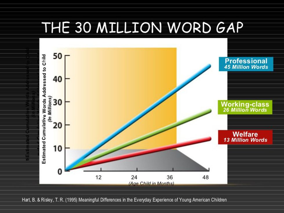By the age of three, children should know, or have been associated with 30 million words. Yes, you heard me correctly, 30 million words. Research shows that children from low-income families are less likely to come in contact with as many words as a child from a high-income family.