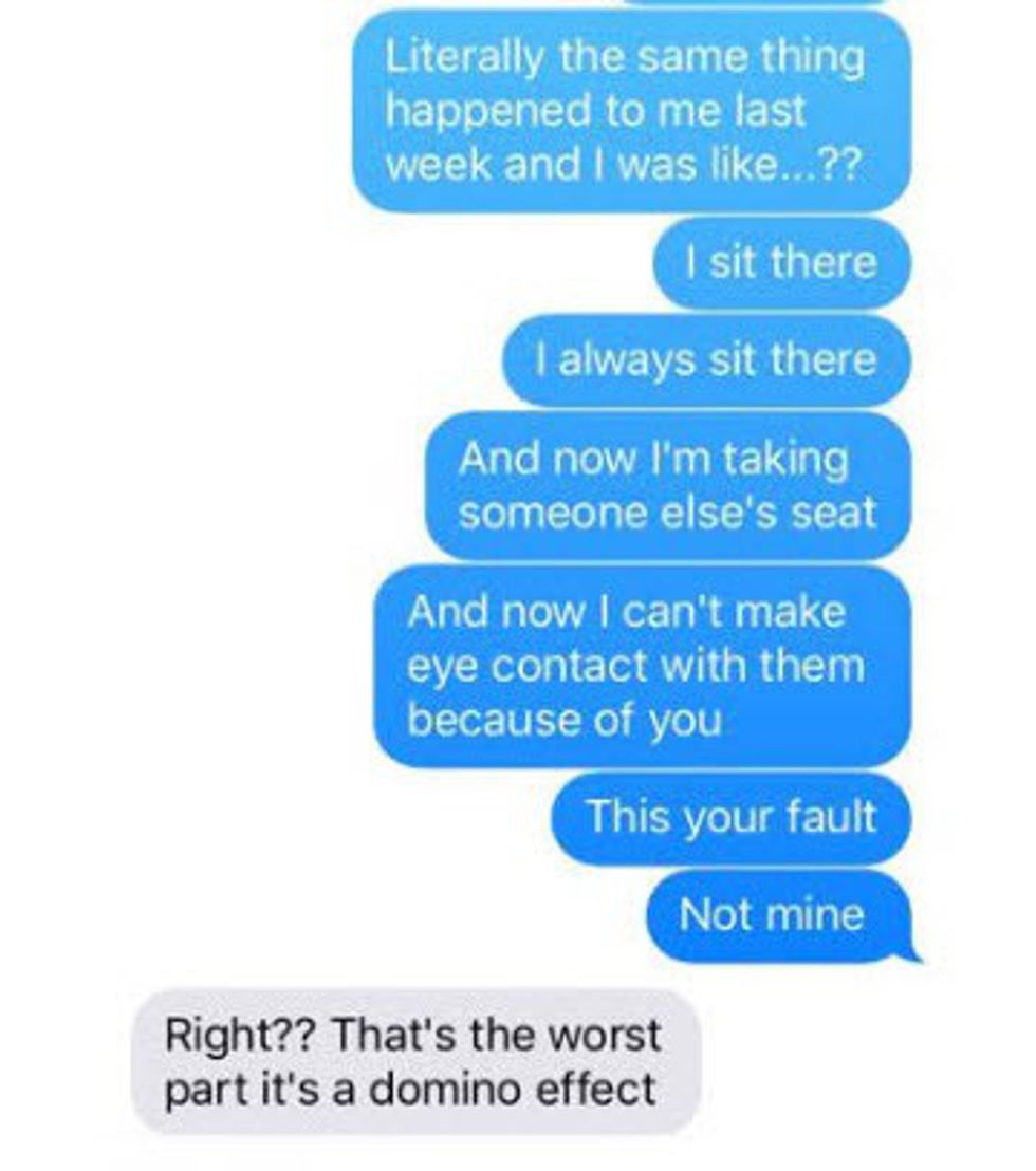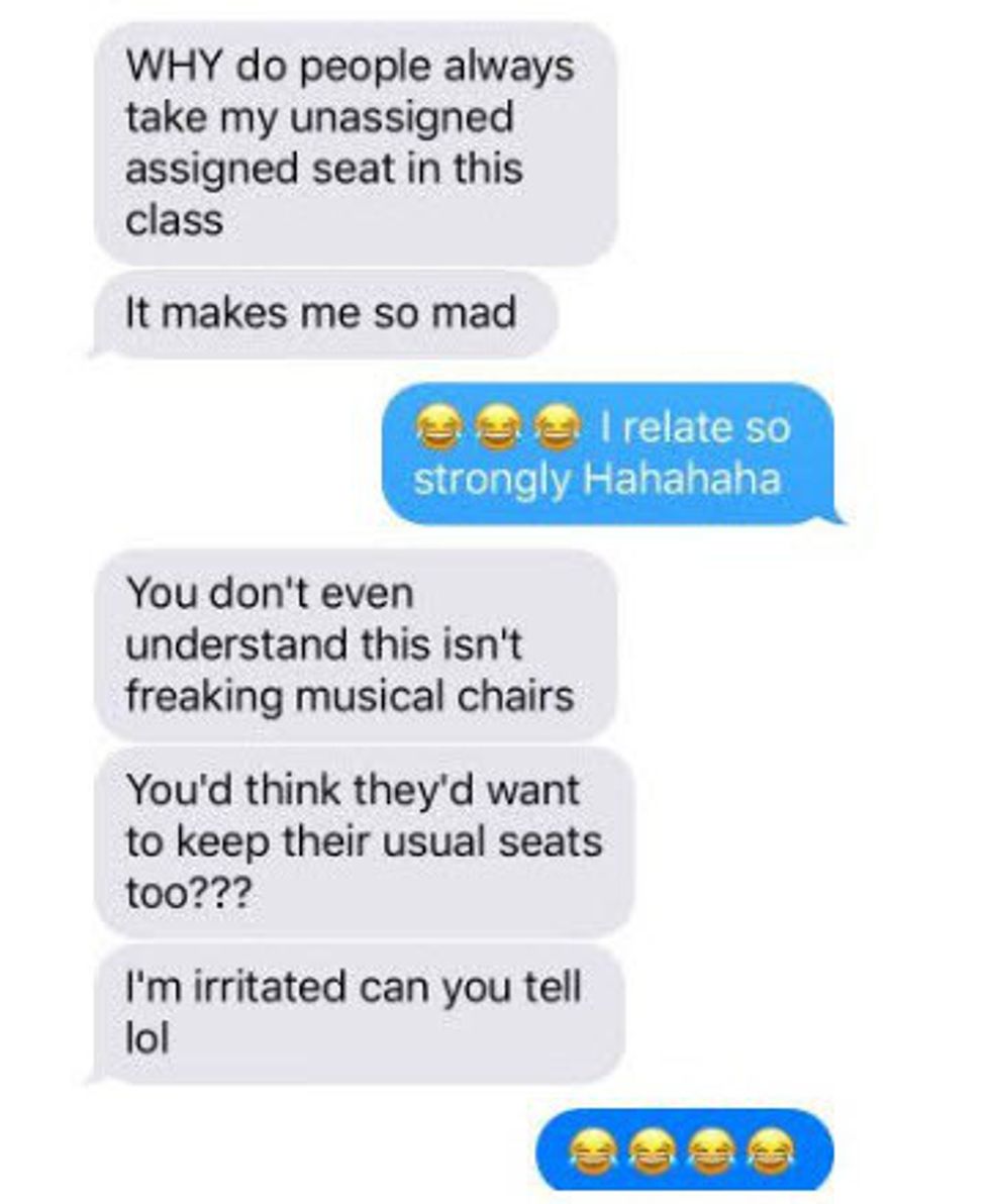 And then:Where we sit on the first day of class is where we should sit for the rest of the semester, so please don't make it confusing by sitting in a different place. If you sit in my seat, I'll have to sit in someone else's seat and then I'll feel so guilty. And while this doesn't necessarily extend to lecture halls, it just seems like a good idea to sit in the same areas.