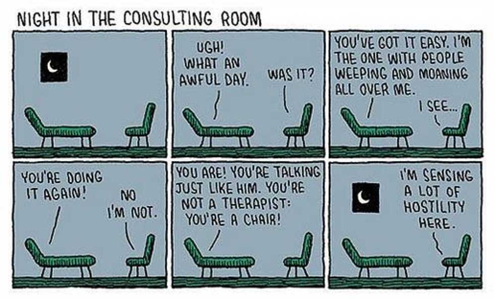 Talk therapy is a form of treatment used for mental illnesses. It's often used in conjunction with other treatment but sometimes used by itself for less severe cases. While methodology, focuses, paradigms and tactics change from patient to patient, and even practitioner to practitioner, one thing stays the same: the practitioner's observation of body language. This analysis begins in the first mere milliseconds of the meeting. One observation commonly used by therapists is the client’s choice of seating. Where he or she sits can give the practitioner insight into the person’s willingness to be in therapy, comfortability in the room, demeanor, and even possible mental illnesses.