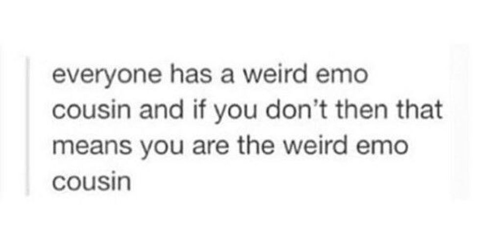 Ok, this cousin is the one that makes you wish you were in your room staring at the wall instead of being at the family’s gathering. (well, him and that aunt that is more interested in your love life than you are). This cousin is probably half your age and you always end up “taking care" of him/her, and he is so annoying that he can’t stop talking, he asks you the same question every flipping time and even if you answer he/she has the “but why not” card. And you know you are taking care of that cousin because the grown-ups are probably in the living room getting drunk and talking about how to roast a nice turkey. How to get rid of them? That’s the thing, you can’t. Just pray for them to grow up fast so they won’t be that annoying forever and for them not to have any type of social media otherwise your news feed will be full of your "lovely" cousin's comments.No matter how much you love and hate your cousin, there will be a moment that you will miss them like hell (trust me, my researches proved that). And if you are like “But Claudia I don’t have that cousin” newsflash, that cousin is probably you. Anyways, love your cousins because they are awesome, when they need something from you, and enjoy your lil cousin because he is going to grow up and you will miss when he was a saint and you though he was the worst thing ever. Just try not to kill them, even if you have 50 cousins, people somehow will notice they are gone.